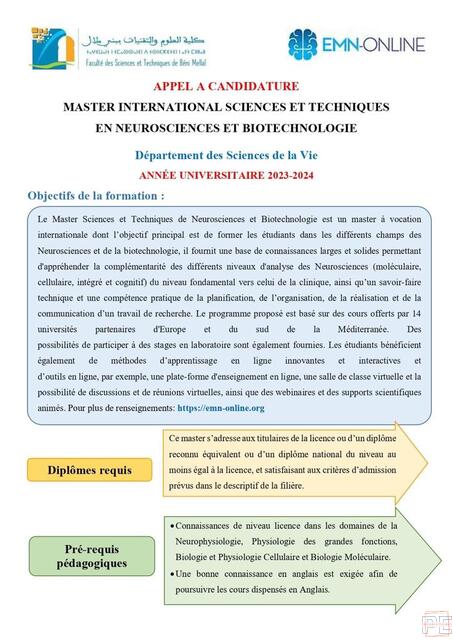 MASTER INTERNATIONAL SCIENCES ET TECHNIQUES EN NEUROSCIENCES ET BIOTECHNOLOGIE