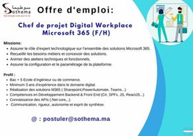 - Chef de projet Digital Workplace Microsoft 365 : Expert en technologie Microsoft 365, développe des solutions numériques.
