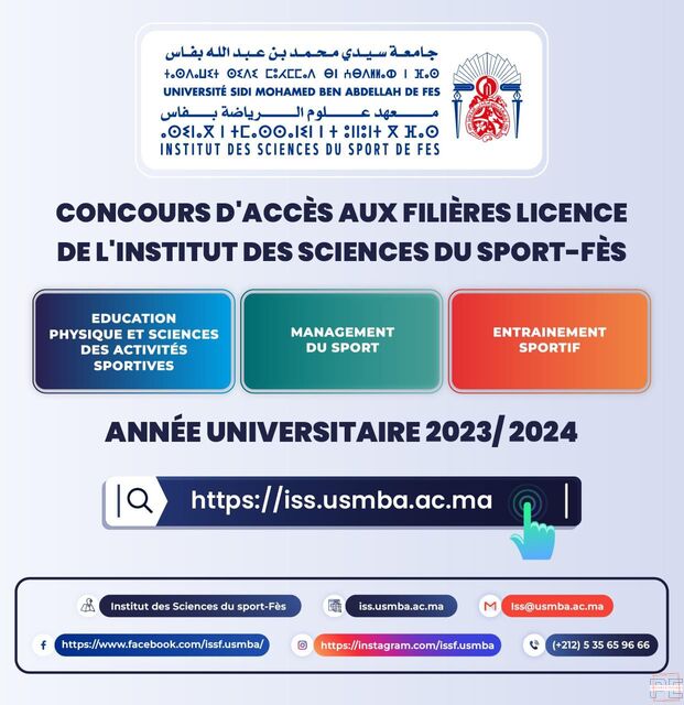 L'Institut des Sciences du Sport de Fès, relevant de l'Université Sidi Mohamed Ben Abdellah, annonce l'ouverture des inscriptions aux concours pour l'accès à la première année des filières licence pour la rentrée académique 2023/2024.