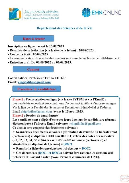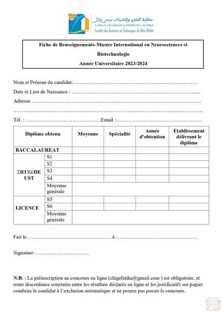 - Envoyer un dossier électronique composé du diplôme de licence, relevé de notes, carte d'identité et formulaire de renseignement sous forme d'un seul fichier PDF nommé : Nom Prénom CNE.